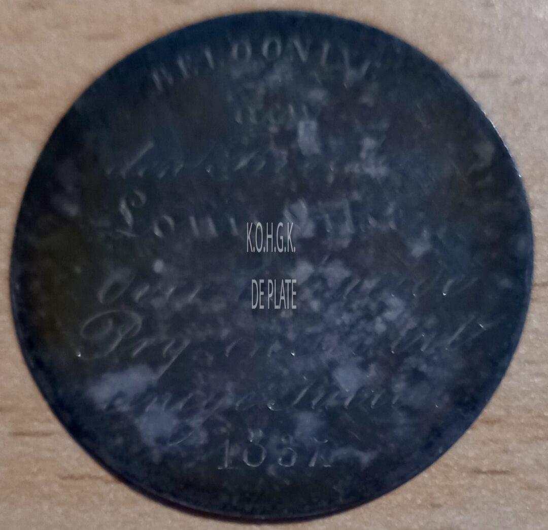 Op de keerzijde : rondom boven →BELOONING←, horizontaal AEN / DEN BROEDER / LOUIS VITSE / OVER BEHAELDE / PRIJZEN SEDERT / EENIGE JAEREN / 1837
