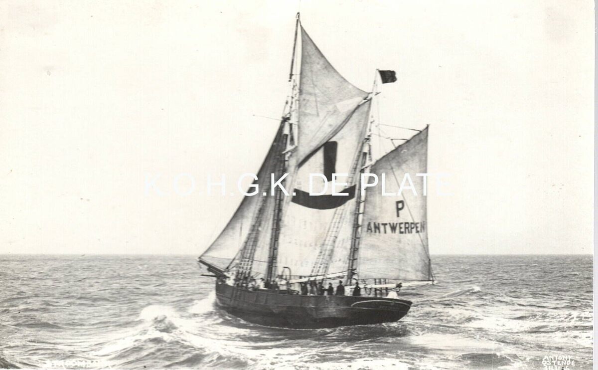 Formaat : 8,5 x 13 cm. - Een oude loodsboot uit de tijd toen er nog met zeilen gevaren werd. De P op de zeilen wijst op Pilot (loods). De loodsen van onze kusthavens en vooral van de Scheldemonding waren zeer dikwijls Oostendenaars die Vlissingen als tweede vaderstad hadden (Omer Vilain)