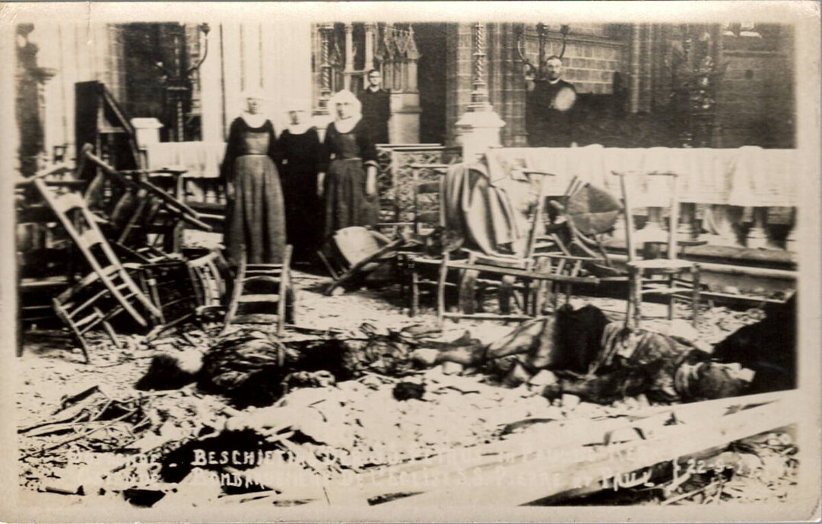 Beschieting Der S.S. Petrus En PaulusKerk - Oostende. Bombardement de L'Eglise S.S. Pierre Et Paul - Ostende 22-9-17. - Tijdens de beschieting van 22 september sloeg ook een bom in op het Sint Petrus en Paulusplein en maakte een grote krater.