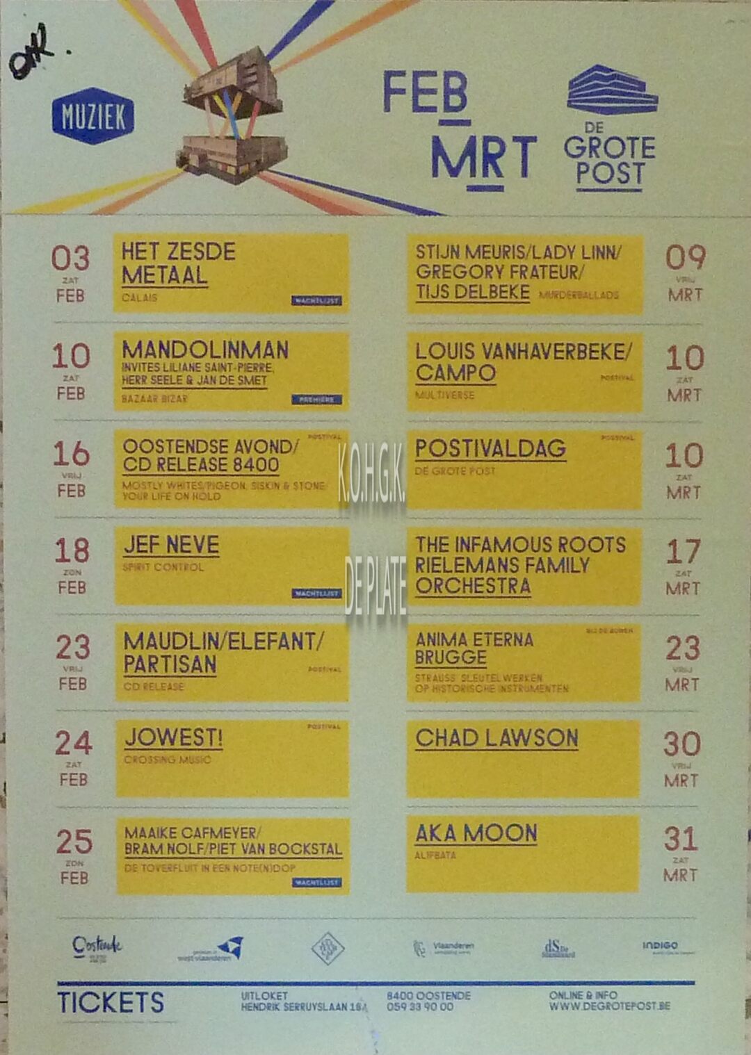 Formaat : 42 x 30 cm. - 03/02 Het Zesde mataal - 10/02 Mandolinman - 16/02 Oostendse avond/CD Release 8400 - 18/02 Jef Neve - 23/02 Maudlin/Elefant/Partisan - 24/02 Jowest! - 25/02 Maaike Cafmeyer/Bram Nolf/Piet Van Bockstal - 09/03 Stijn Meuris/Lady Linn/ Gregory Frateur/Tijs Delbeke - 10/03 Louis Vanhaverbeke/Campo - 10/03 Postivaldag - 17/03 The Infamous Roots Rielemans Family Orchestra - 23/03 Anima Eterna Brugge - 30/03 Chad Lawson - 31/03 Aka Moon