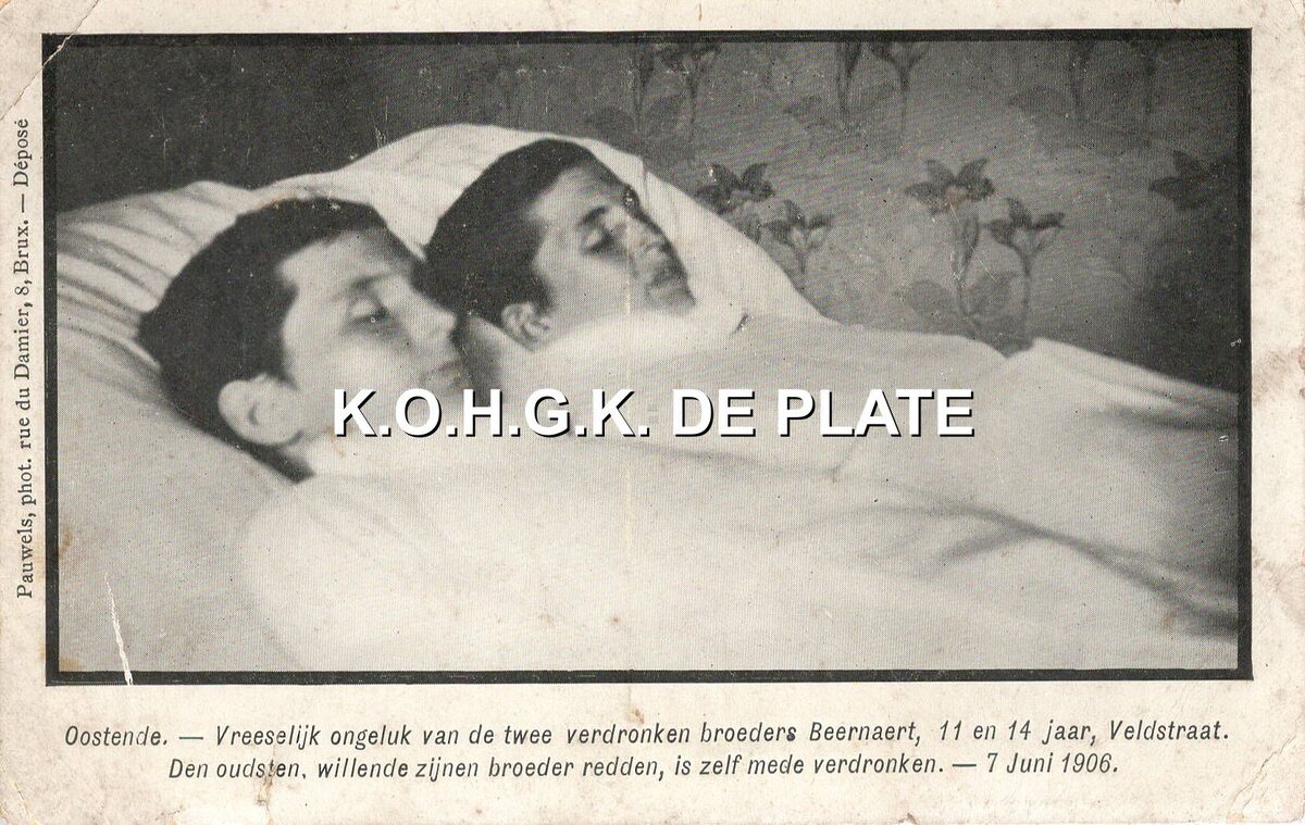 Formaat : 9 x 14 cm. - De gebroeders Beernaert, 11 en 14 jaar, verdronken in zee ter hoogte van het Royal Palace Hotel. De oudste broer verdronk terwijl hij probeerde zijn broer te redden.