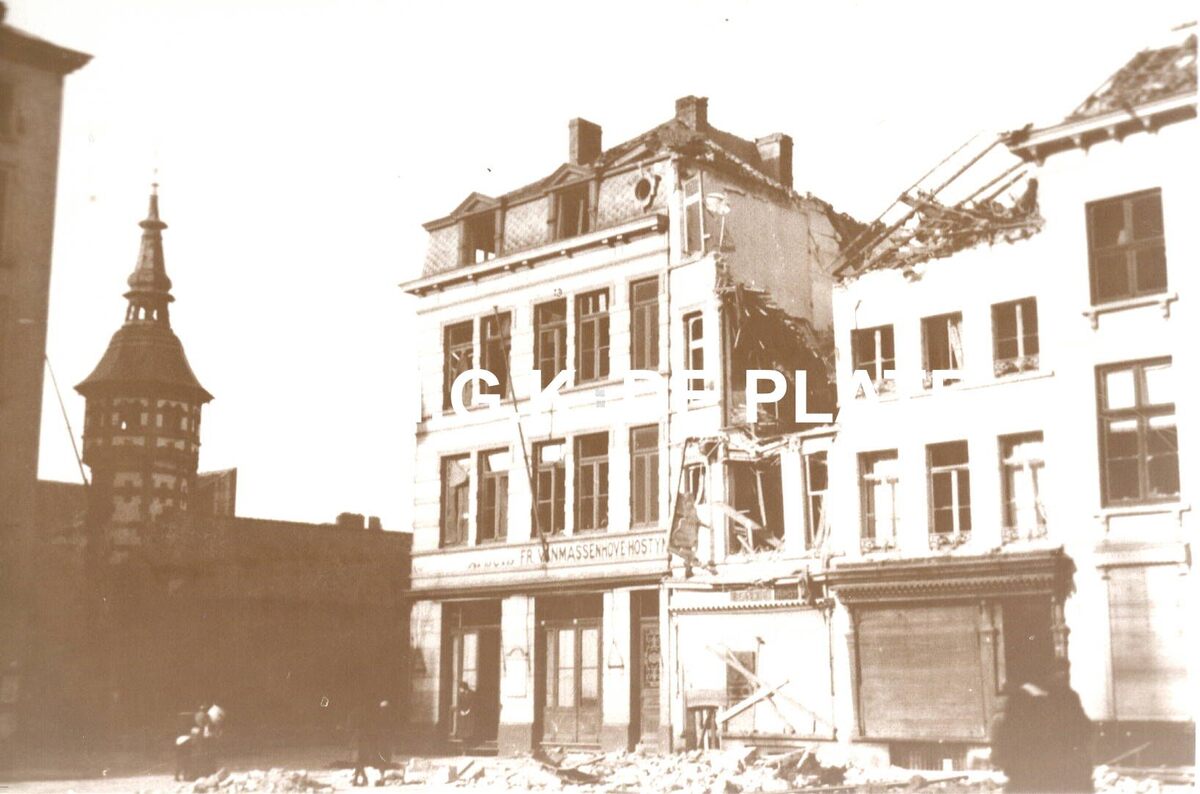Formaat : 9,5 x 14 cm. - Vernielde gebouwen op de Groentemarkt. Links het torentje van de vleesmarkt