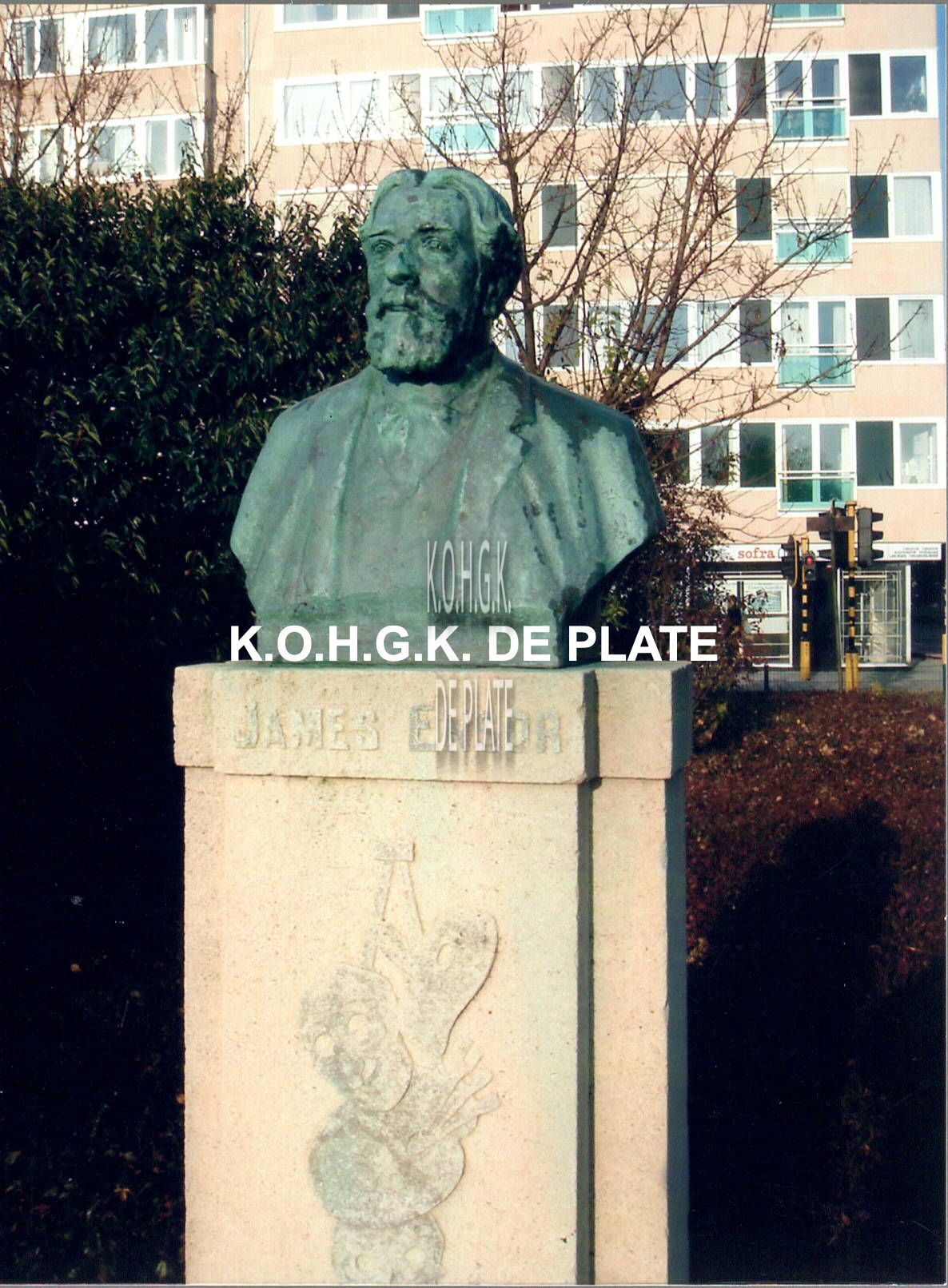 Formaat : 13,5 x 10 cm. - Het James Ensor-monument in het Leopoldpark. Replica in brons door Irenée Duriez in 1985. Het origineel werd gemaakt door de Brusselse beeldhouwer Edmond De Valériola in marmer en werd in 1930 officieel ingehuldigd in het kursaal plantsoen.