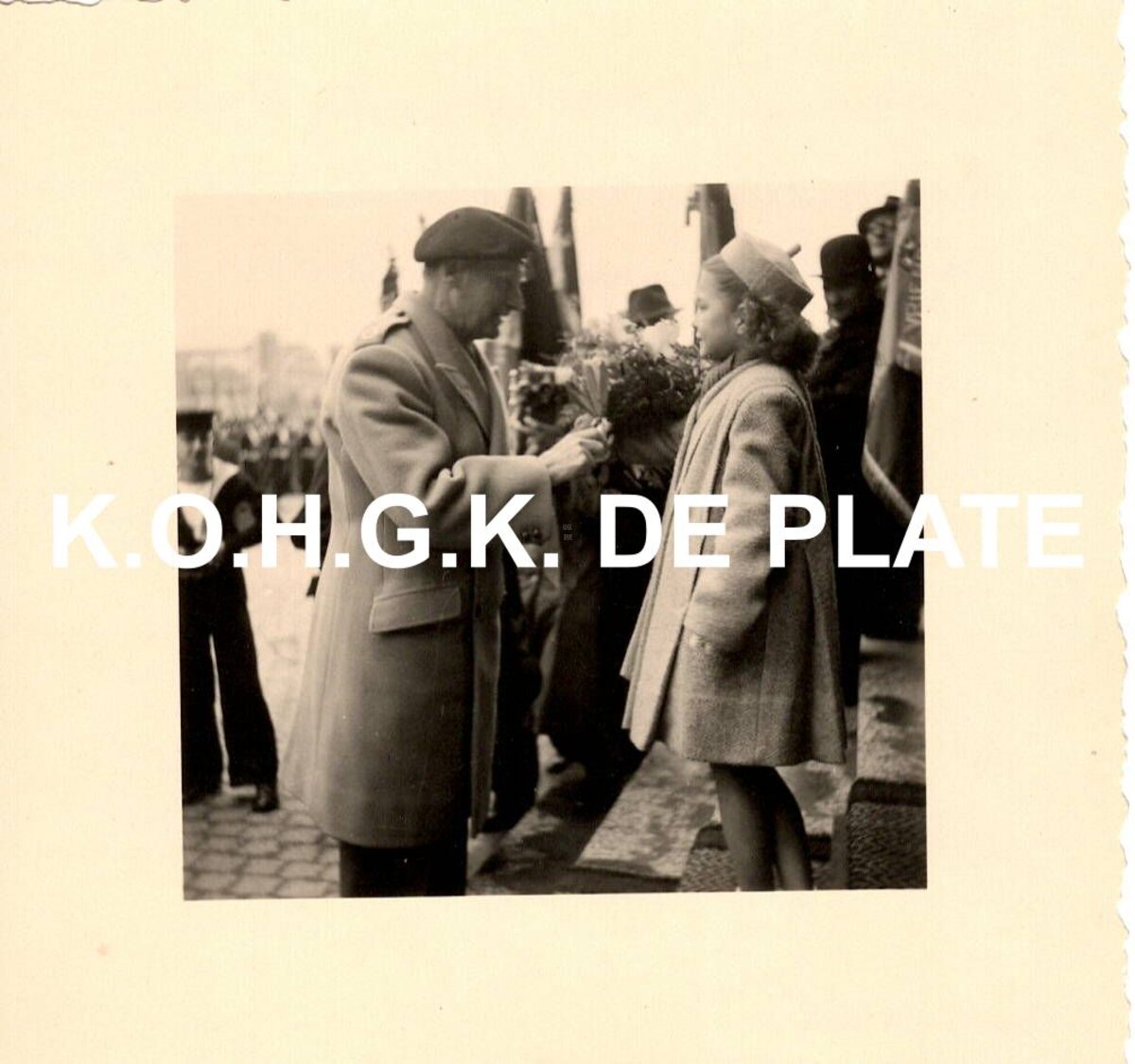 Formaat : 5,5 x 5,5 cm. - Overhandiging van bloemen aan Montgomery bij het binnentreden van het stadhuis