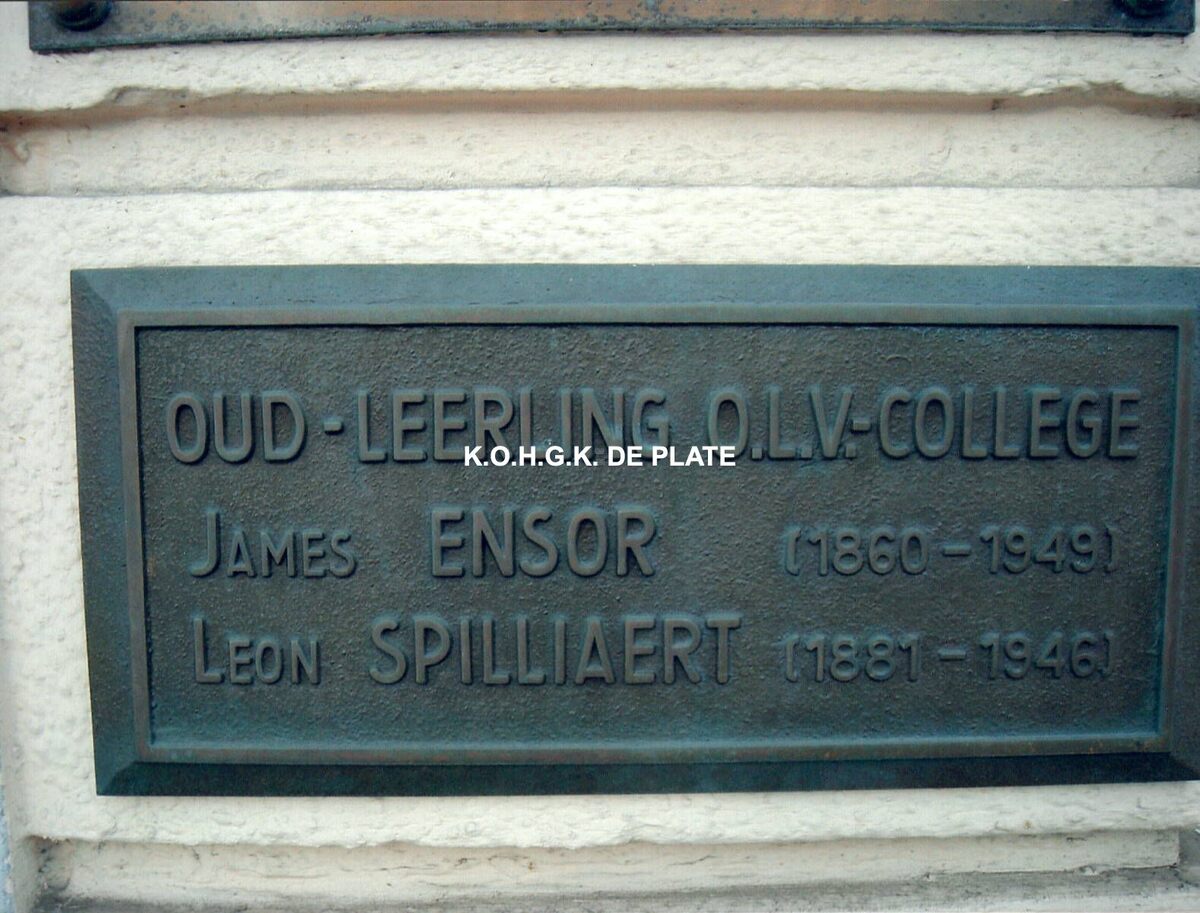 Formaat : 10 x 15 cm. - De gedenkplaat hangt rechts van de deur in de Vindictivelaan met volgende tekst : Oud-Leerling O.L.V.-College : James Ensor (1860-1949), Leon Spilliaert (1881-1946)
