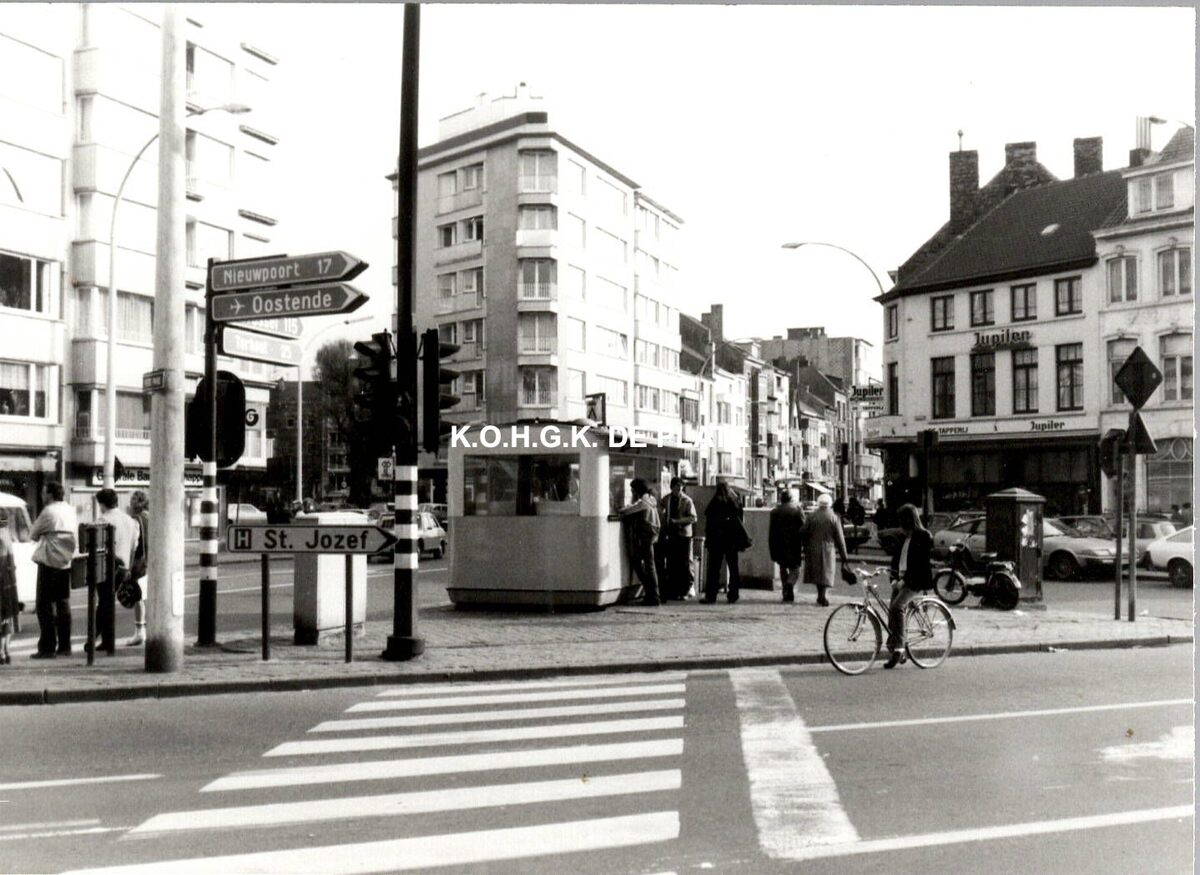 Formaat : 9 x 12,5 cm. - Op het kruispunt staat nog een frietkraam. In de achtergrond links de Torhoutsesteenweg, rechts de Alfons Pieterslaan en vooraan de Koninginnelaan
