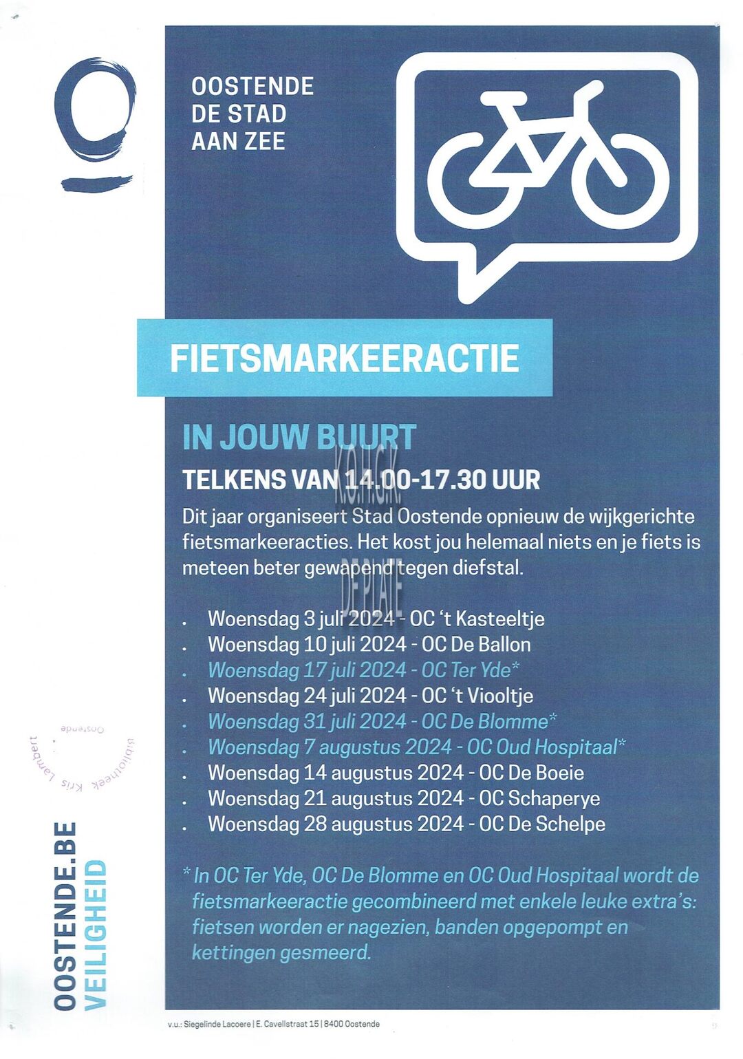 Formaat : 42 x 30 cm. - Dit jaar organiseert Stad Oostende opnieuw de wijkgerichte fietsmarkeeracties. Het kost jou helemaal niets en je fiets is meteen beter gewapend tegen diefstal.