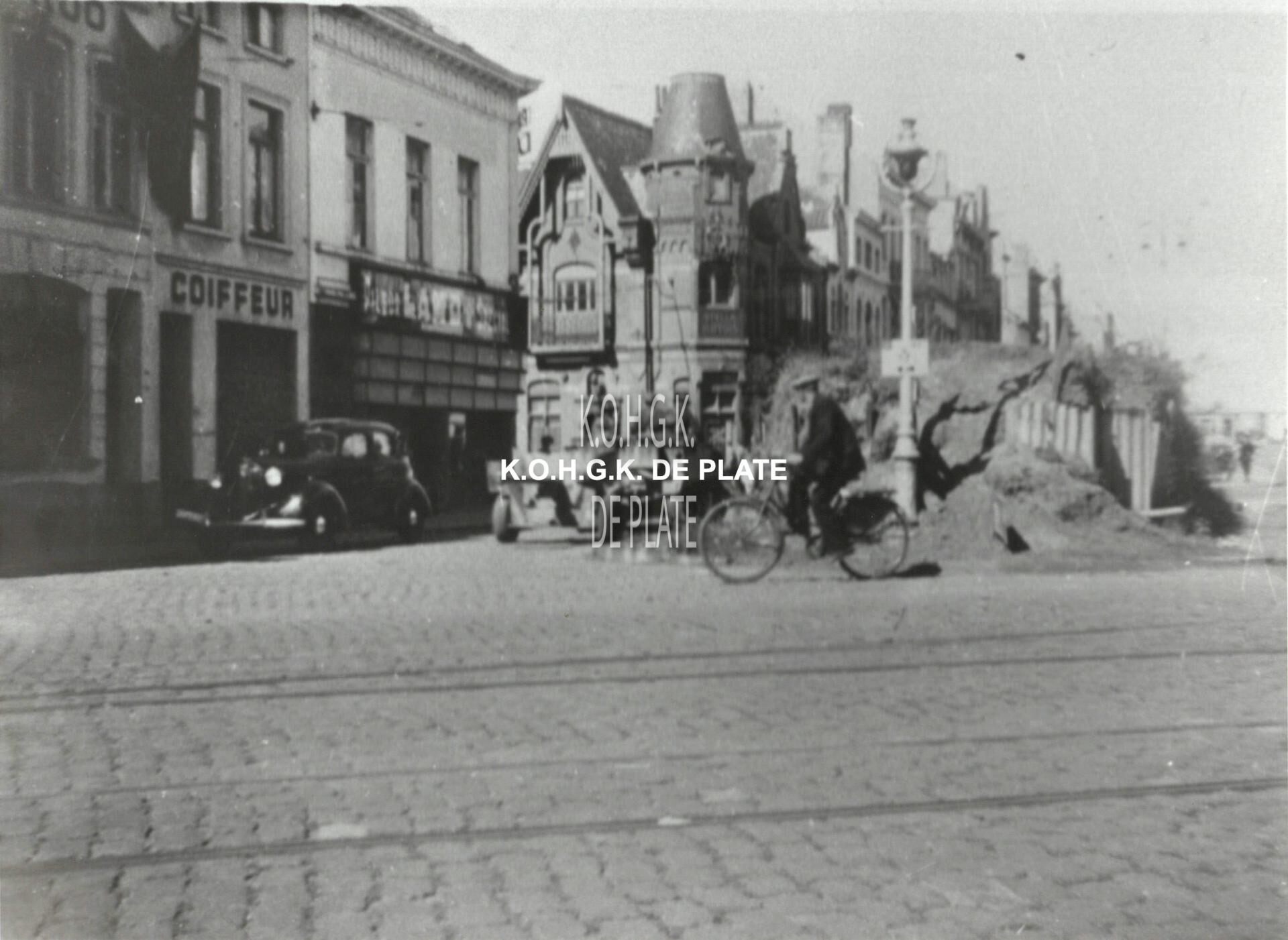 Formaat : 17 x 24 cm. - Vooraan trampsporen op de Torhoutsesteenweg. Op de hoek rechts van de Nieuwpootsesteenweg "Le Chatelêt"