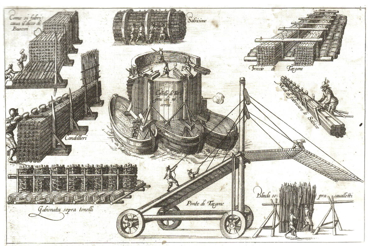 Tropic T 438. - Oostende als "Kriegshul" met de verschillende uitvindingen van P. Targone. - De verschillende uitvindingen waren om de grootste troef van de belegerden uit te schakelen zoals aanvoer van munitie, manschappen en levensmiddelen via de nieuw gevormde haven of "Geule". Midden boven de Salzicione : bood dekking aan de belegeraars. Centraal het Castele die Targone : een varende belegeringstoren Midden onder de Ponte die Targone : een soort brug. Hoewel spectaculair niet echt een succes