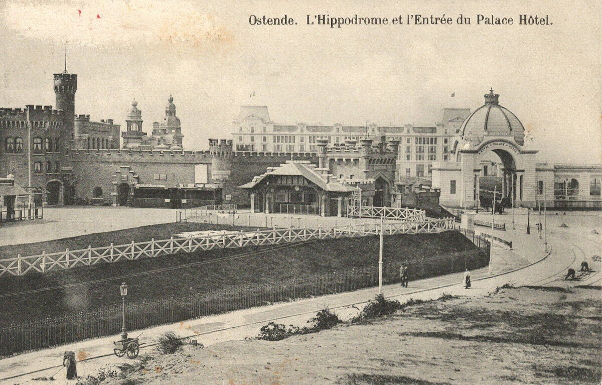 Ostende. L'Hippodrome et l'Entrée du Palace Hôtel - Links, de Wellingtonrenbaan met het Fort Wellington als imposante toegang en de ingang van het "Royal Palace Hotel", gezien vanuit de Koersenlaan (huidige Koningin Astridlaan)