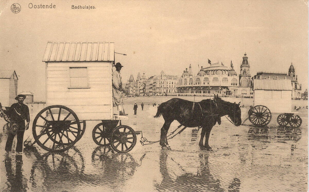 Albert, Ern. Thill, Simonisstraat, 20-22, Brussel. - Ostende Badhuisjes. - De badkarren worden door paarden in zee getrokken.In de achtergrond het derde Kursaal