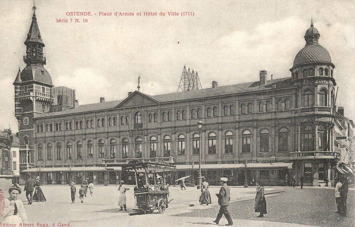 Editeur albert Sugg à Gand, Série 7, N° 10. - OSTENDE - Place d'Armes et Hôtel de ville (1711). - We zien het Oud Stadhuis op het Wapenplein, op de voorgrond een ijscokar