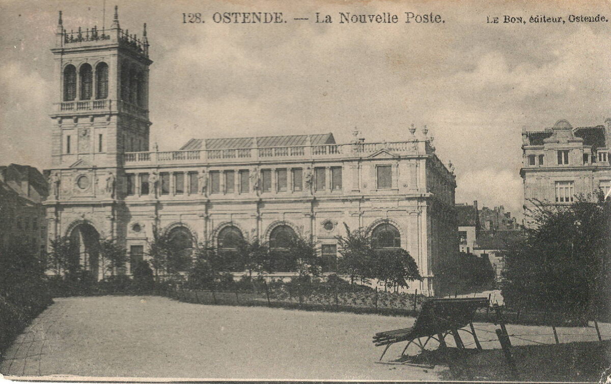 Le Bon, éditeur, Ostende. 128 OSTENDE. - La Nouvelle Poste. - Het postgebouw in de Hendrik Serruyslaan gezien vanuit het Leopoldpark. Links, de huidige Wittenonnenstraat, rechts de Ooststraat (huidige Poststraat)