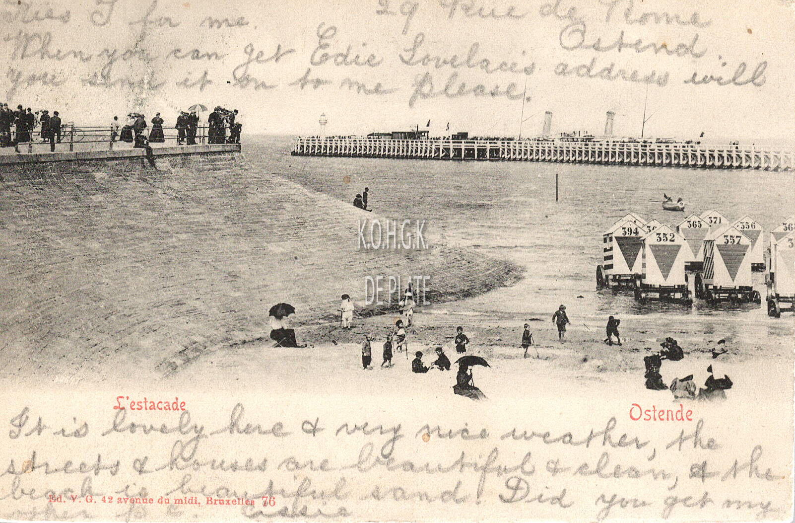 Ed. V.G. [=Victor Grégoire], 42, avenue du midi, Bruxelles, 76. - Ostende - L'Estacade. - Het Klein Strand met de traditionele badkarren, en Weststaketsel