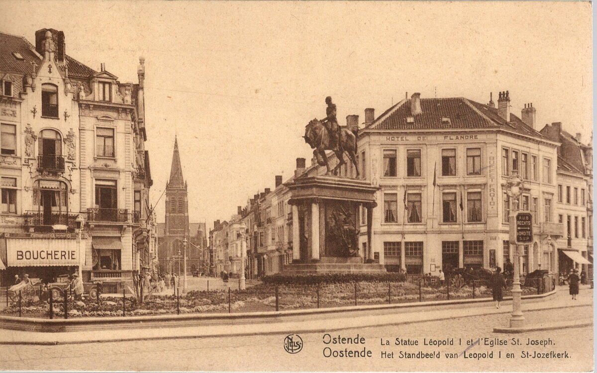 Het Leopold I-monument op het Leopold I-plein. Rechtdoor de Rogierlaan met in de achtergrond de Sint-Jozefskerk, rechts de Torhoutsesteenweg