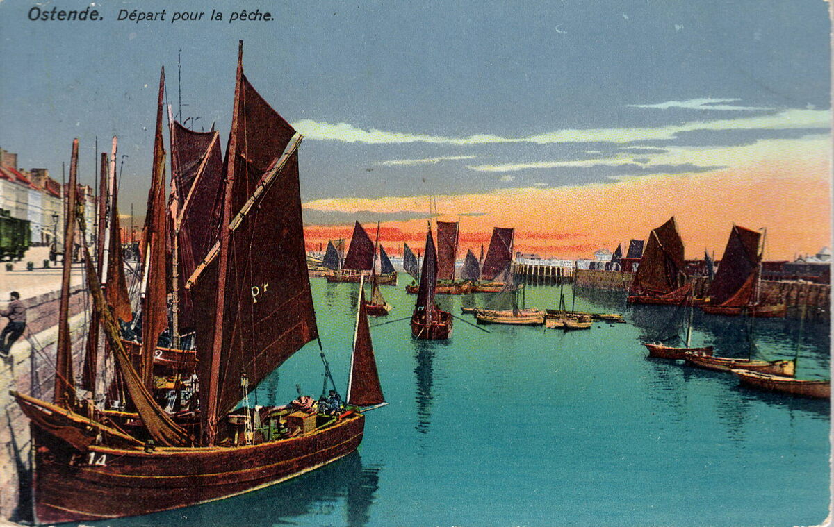 Le Bon, éditeur, Ostende, . - Ostende. Départ pour la pêche. - In het midden, open garnaalboten of Oostendse schovers. Links, de Visserskaai. Aangemeerd, een panneschuit, de P.14 "Marie Thérèse".