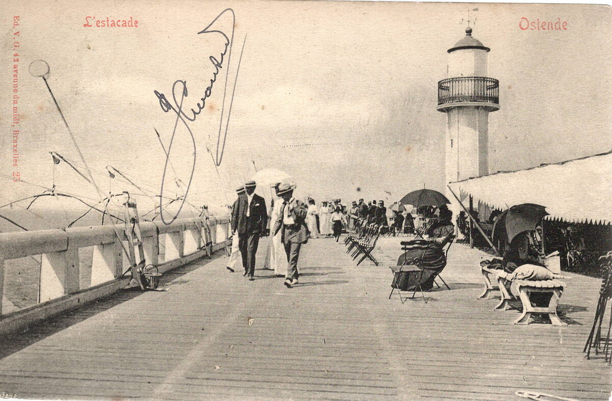 Ed. V.G., 42 avenue de midi Bruxelles 25. - Ostende, l'Estacade. - De mistbel op het einde van het Weststaketsel, Toeristen genietend van de zon