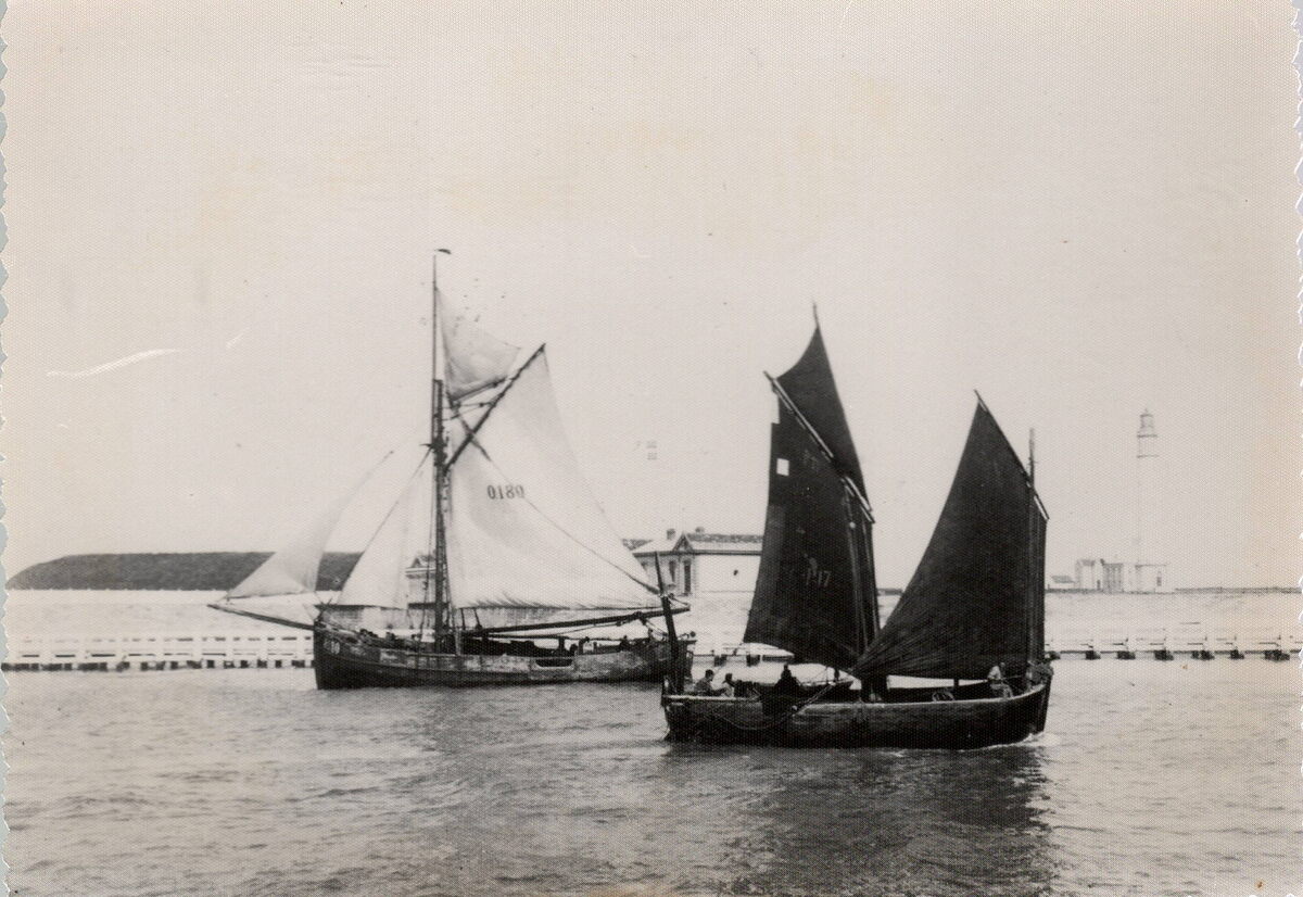 Formaat : 12 x 17 cm. - Vooraan een Panneschuit links een Oostends schipje. Op de Oosteroever helemaal rechts de tweede vuurtoren, helemaal links de Halve Maan en inhet midden het quarantainegebouw