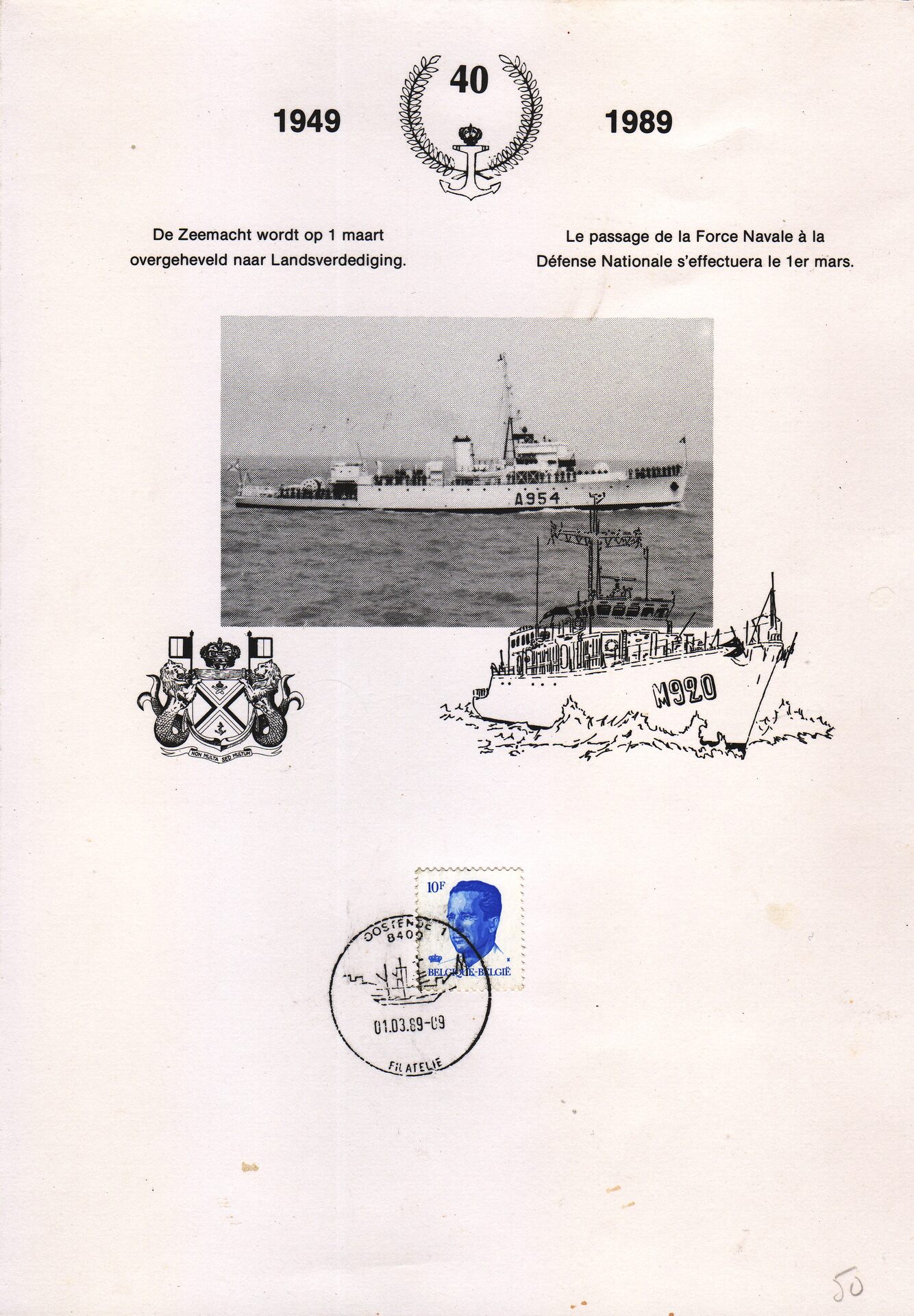Foto van de A.954 Adrrien de Gerlache en tekening van de M.920 Iris, afgestempeld op 01-03-1989. De Zeemacht wordt op 1 maart overgeheveld naar landsverdediging. Le passage de la Force Navale à la Défense Nationale d'effectuera le 1er mars