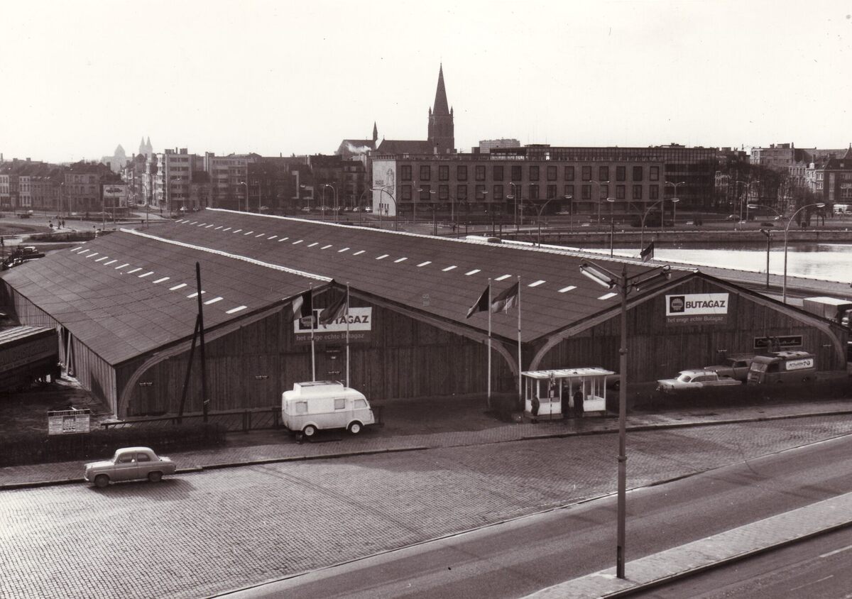 Formaat : 13 x 18 cm. - De gebouwen staan op de plaats van het oud station aan het Ernest Feysplein. In de achtergrond het stadhuis en de toren van de Sint-Jozefskerk.
