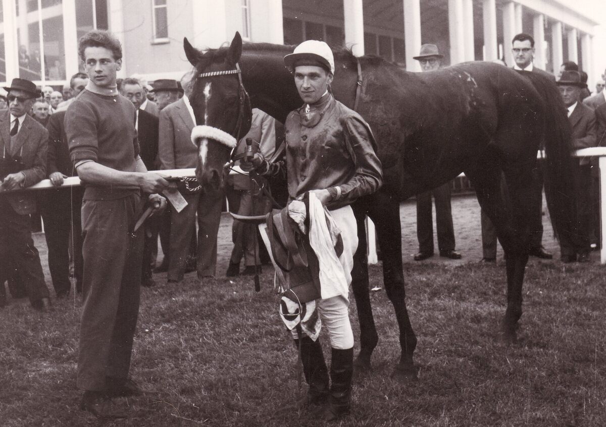 Formaat : 13 x 18 ml. - Jockey met paard en een stalknecht in de paddock