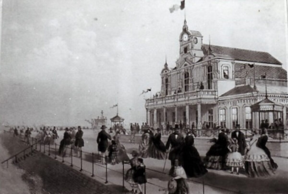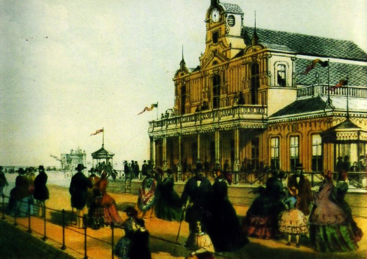 Foto z/w 13 x 9 + negatief. Het eerste kursaal, gebouwd in de periode 1851-1852, naar de plannen van architect Henri Beyaert. Gelegen op de buitenste vestingswal tussen de hellingen van de Vlaanderen- en Christinastraat.