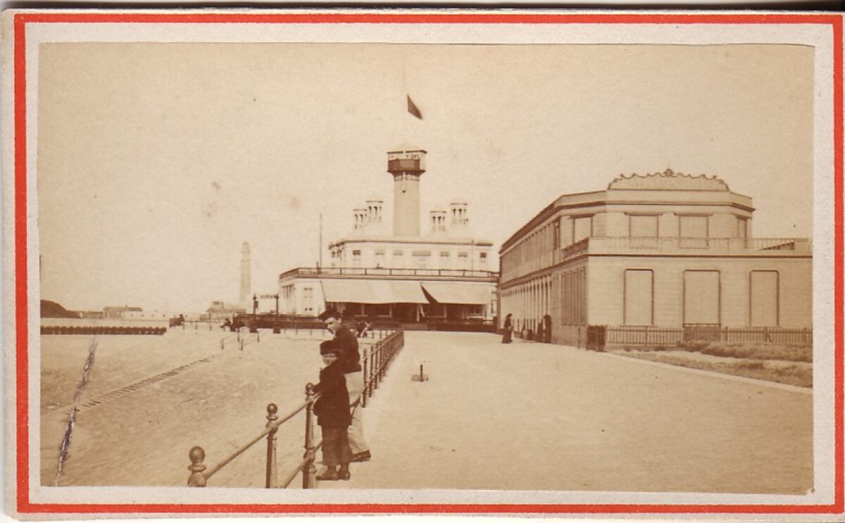 Foto : 10 x 6 cm. Rechts "Pavillon Royal". "Houten paviljoen gebouwd op een bakstenen fundering. Opgetrokken aan de rand van de Zeedijk op het uiteinde van de Van Iseghemlaan. Verbouwd in 1842 en nu uitgebreid en op het platform een overdekt terras. Voorzien van een toiletcomplex en voorzien van een gaanderij. Het nieuwe rechthoekige gebouw, dat op de westkant wordt geplaatst van het eerste paviljoen en een verdieping telt is nog voor het begin van het badseizoen 1842 afgewerkt.