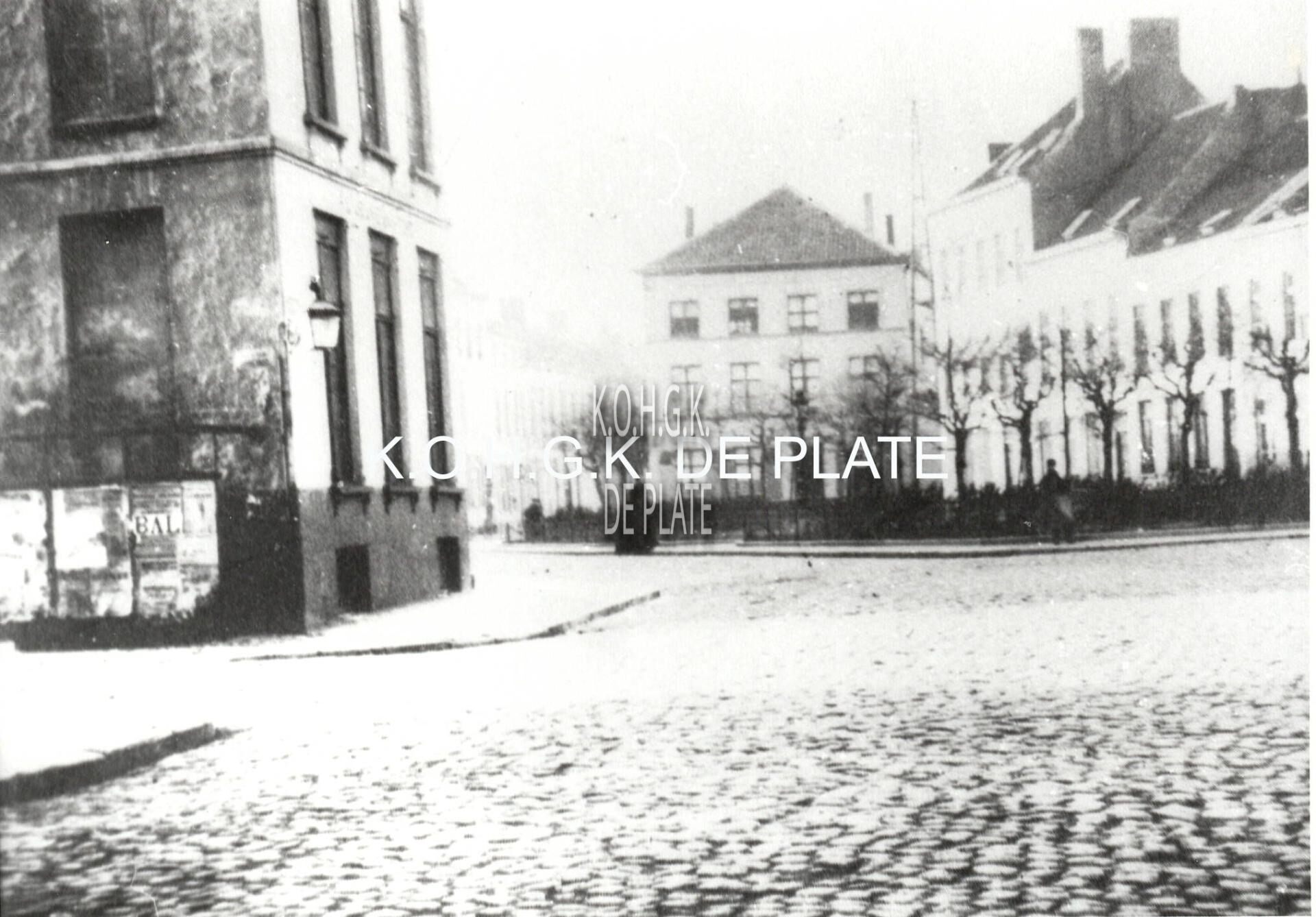 Formaat : 13 x 18 cm. - Foto gezien vanuit de Kerkstraat. De zijstraat links is de Sint-Paulusstraat met herberg Karel de Goede. Op de achtergrond (midden) zien we de pastorie van de hoofdkerk, de huizenrij in Prins Boudewijnstraat werd in 1899 afgebroken voor de bouw van de Sint-Petrus en Pauluskerk.