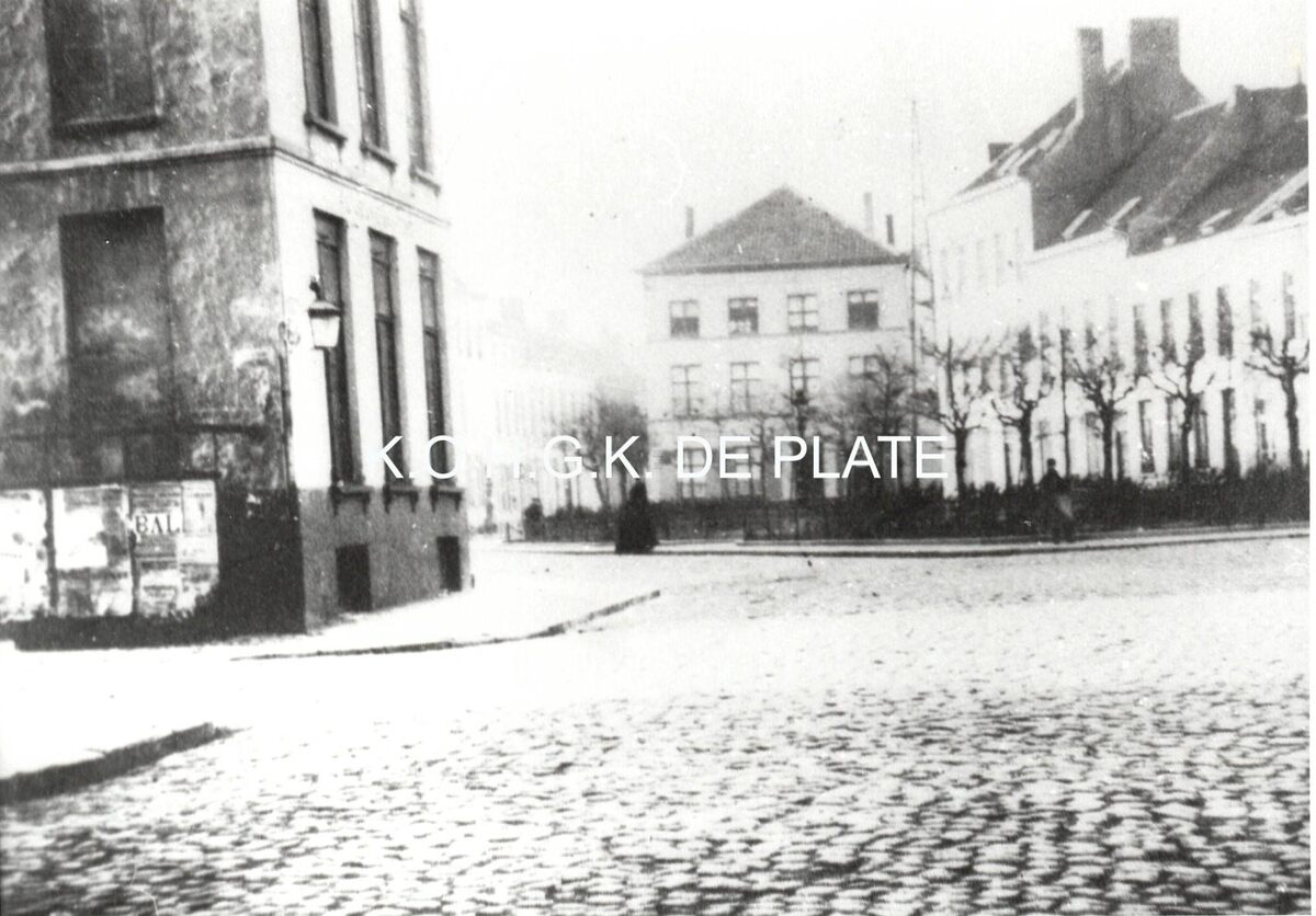 Formaat : 13 x 18 cm. - Foto gezien vanuit de Kerkstraat. De zijstraat links is de Sint-Paulusstraat met herberg Karel de Goede. Op de achtergrond (midden) zien we de pastorie van de hoofdkerk, de huizenrij in Prins Boudewijnstraat werd in 1899 afgebroken voor de bouw van de Sint-Petrus en Pauluskerk.