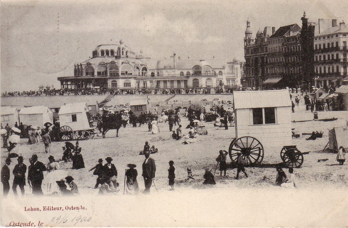 Le Bon, éditeur, Ostende, N°1. - Ostende - Plage et Kursaal. - Ex invent nr 1977/2257. - Typisch strandtafereel tijdens de Belle Epoque. Strandrecreatie op het Groot Strand nabij de de westelijke gevel van het tweede Kursaal langs de Zeedijk. Op de achtergrond zie je ook dat er strandtenten werden verhuurd. Zij boden bescherming tegen wind en zon. Rechts, detail van de grote hotels
