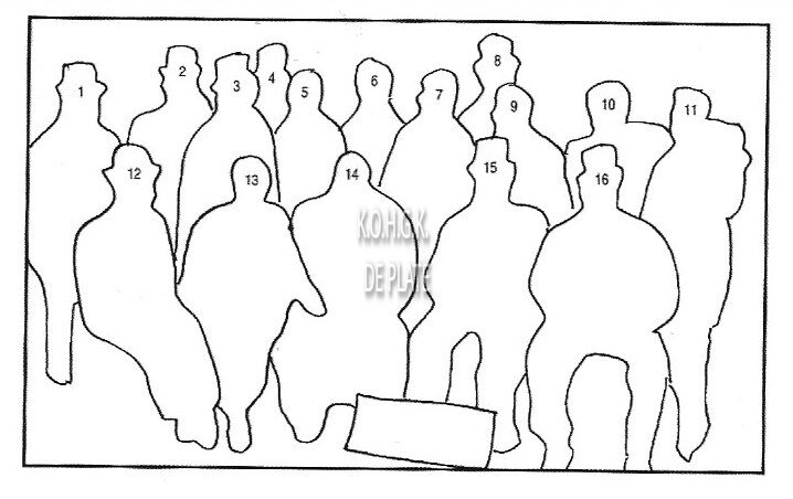 (1) Deridder Fréderic - (2) Seeuwen Henri - (3) Ditte Albert - (4) Brouwet Léon - (5) Van Craeynest Daniel - (6) Pede August - (7) Bulcke Emile - (8) Daveluy Georges - (9) Bulcke Georges - (10) Mathieu Emile - (11) Mertian Victor - (12) Quinet Edgard - (13 Pleyn Firmin - (14) Cnudde Gustave - (15) Rinskopf Léon - (16) Cambier Arthur. De afwezige op de foto was James Ensor
