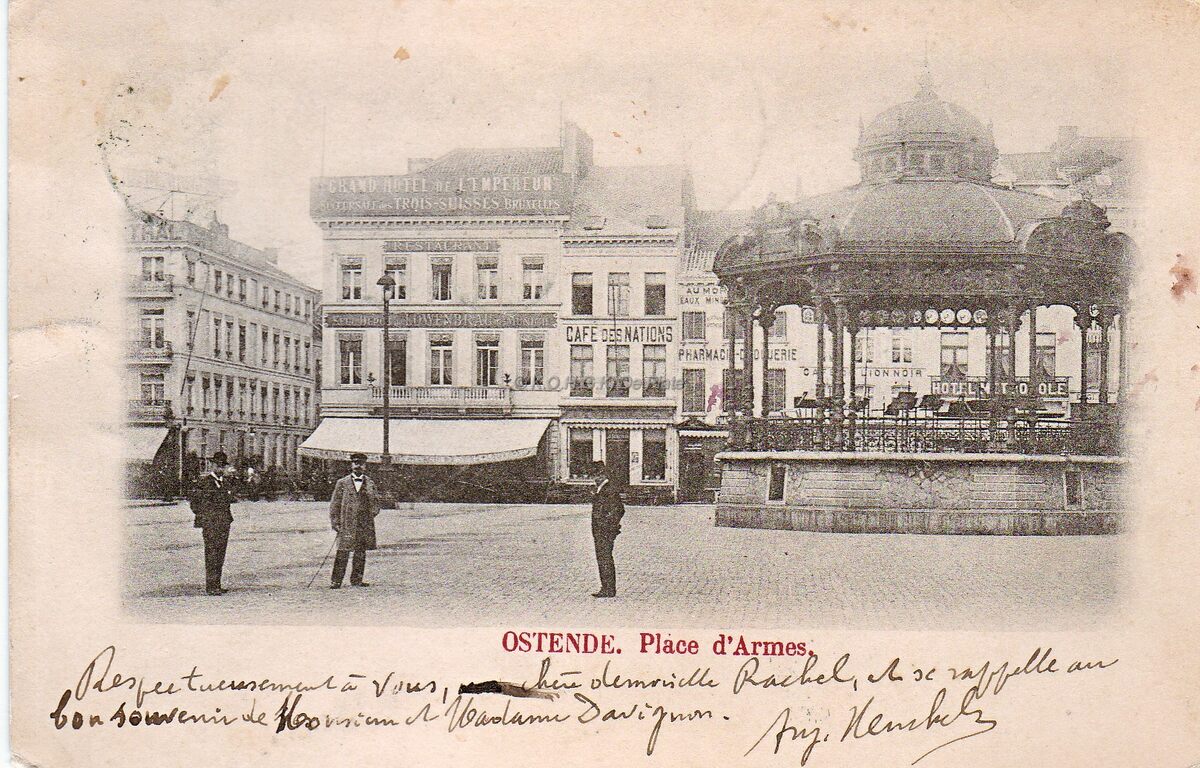 Het Wapenplein, met op de hoek van de Vlaanderenstraat, het Grand Hôtel de l'Empereur , rechts ernaast, Café des Nations" Ondanks, twee wereldoorlogen, staat de kiosk er nog.