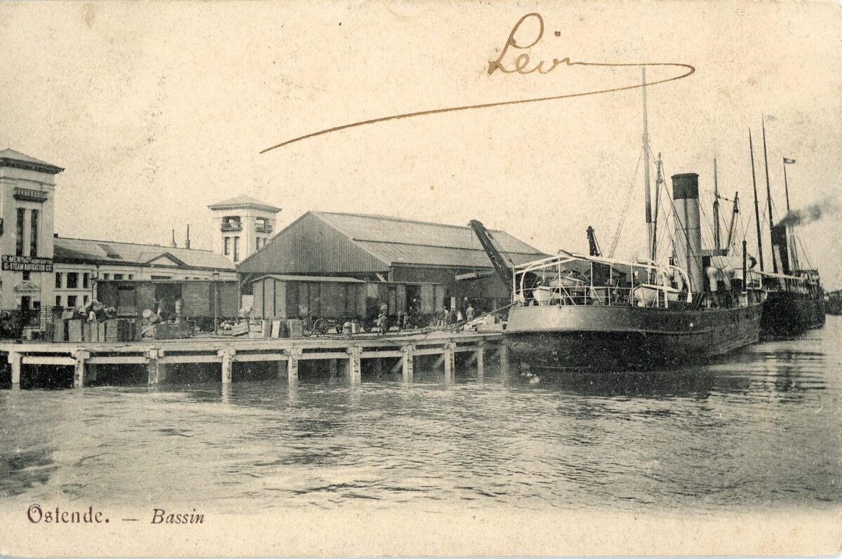 Ostende. Bassin. Tilbury schepen van de John Cockerill rederij tijdens het lossen of laden in de Visserskreek nabij de oude vismijn. Deze vrachtschepen onderhielden een regelmatige lijnvaart tussen Oostende en Tilbury. Tilbury ongeveer 56 km van Londen, waar de goederen verder vervoerd werden met de "London-Tilbury Southend Railway", waar ze verkocht werden op de markten van Bellingsgate en Covent-Garden. De vrachtschepen "Topaze", "Rubis" en "Saphir" voerden in 1905 : in 120115 ton en uit 121286 ton.