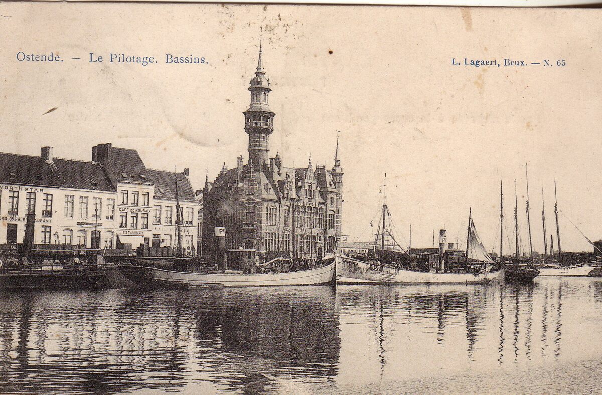 L. Lagaert, Brux., nr. 65. Ostende - Le pilotage. Bassins. Het gebouw met het torentje is het Zeevaartcommissariaat, ook de Pilotage genoemd, gelegen hoek Keizerskaai en Zuidstraat. In dit gebouw waren het Loodswezen, het Zeevaartcommissariaat, de Zeevaartschool en de Dienst voor de Zeevisserij ondergebracht. Het gebouw, in neo-vlaamse renaissancestijl, werd opgetrokken in de winter van 1898 op 1899, naar de plannen van architect Charles De Wulf. De aannemers waren de gebroeders Demeyer uit Gent.