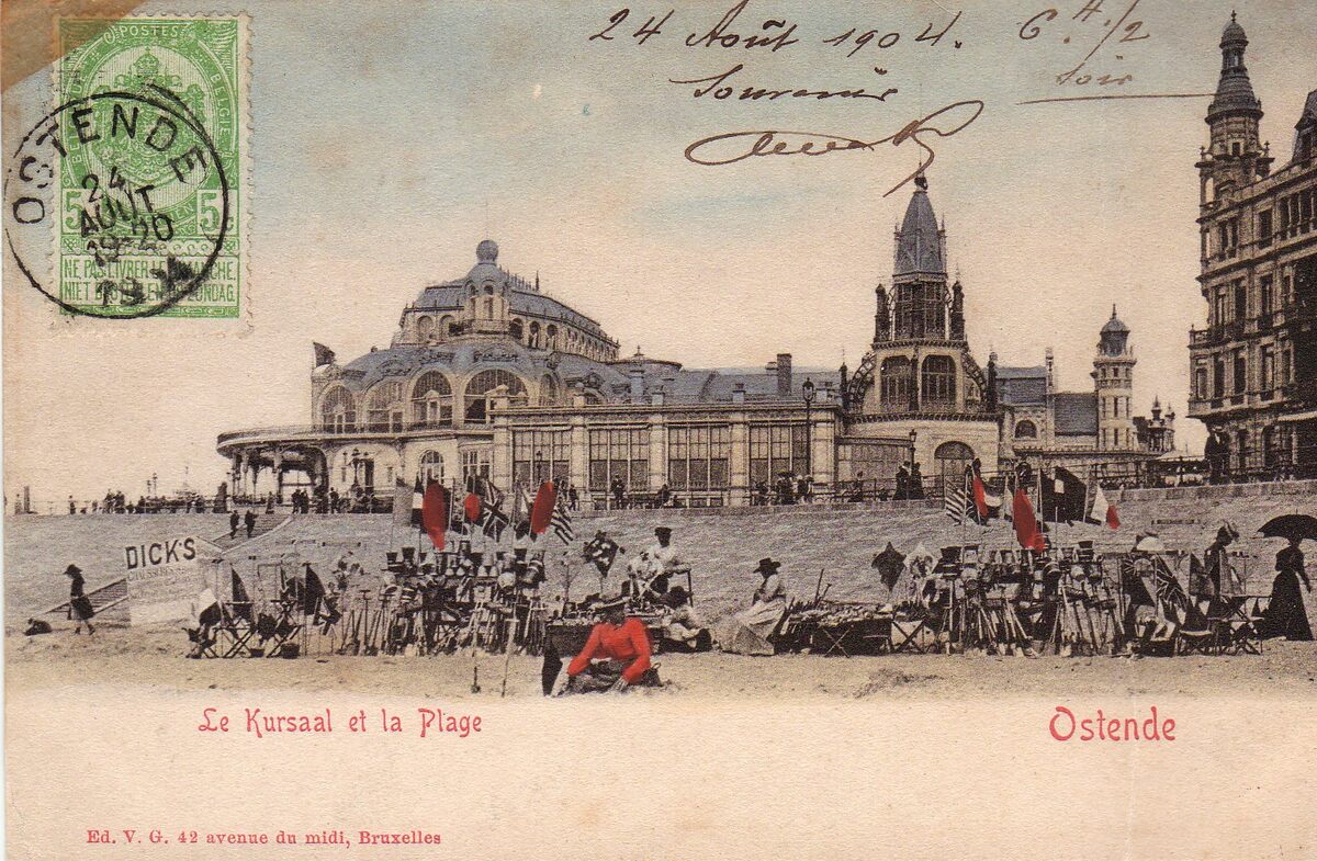 Victor Grégoire/V.G. - Ostende - Le Kursaal et la Plage. - Bijgekleurde kaart.