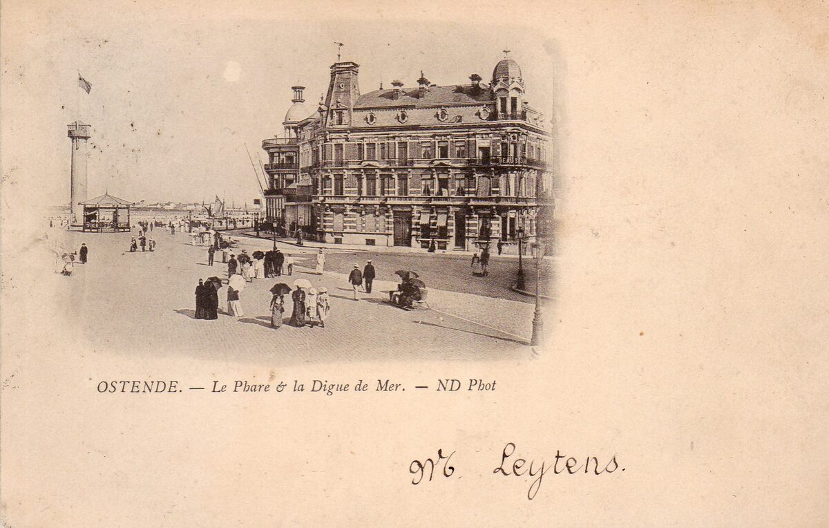Neurdein/ND Phot. - Ostende - Le Phare & Le Digue de Mer. Een zonnige dag in Oostende tijdens de Belle Epoque. De Zeedijk met de eerste vuurtoren, in de volksmond de vlaggestok genaamd. Een verplaatsbare kiosk. De dames beschermen zich tegen de zon met hun parasol.
