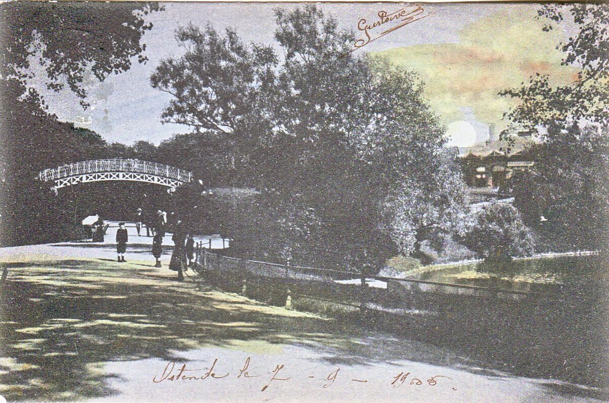 Le Bon, éditeur, Ostende, N° 91. - Ostende - Le parc Léopold. - Bijgekleurde kaart. - Links, de ijzeren brug die voor de verbinding zorgde tussen de Trinkhall en de fontein