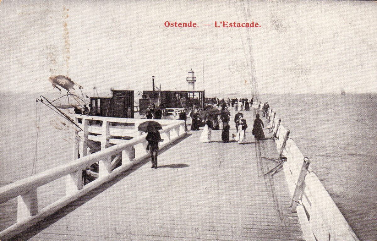 Ostende - L'Estacade. - Het einde van het Weststaketsel, of "'t koptje van 't hoofd", waar je in het café-paviljoen kon genieten van een drankje en de gezonde zeelucht. Populair was ook, met een kruisnet een krabbetje of visje te vangen. Een wandeling op het staketsel was populair bij de toerist en de Oostendenaar. Oostende tijdens de Belle Epoque, waar de dames zich met een parasol beschermden tegen de zon. Een bruine huid was toen niet in de mode.