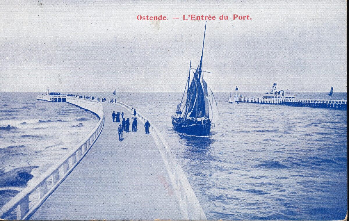 Ostende - L'Entrée du Port. - Een vissersvaartuig vaart de haven van Oostende binnen. Links, het Weststaketsel en rechts, het Ooststaketsel met tijseinpost