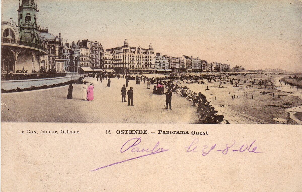 Le Bon, éditeur, Ostende, N° 12. - Ostende - Panorama Ouest. - Bijgekleurde kaart. - We zien de Zeedijk ten westen van de kursaal richting het Koninklijk Chalet. Rechts, het Groot Strand