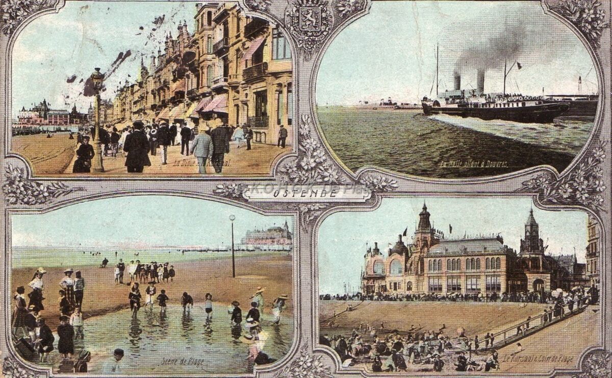 Aqua photo. Ostende. - 4 foto's. La Digue et le Kursaal, La Malle alient à Douvres, scène de plage, Le kursaal et coin de plage
