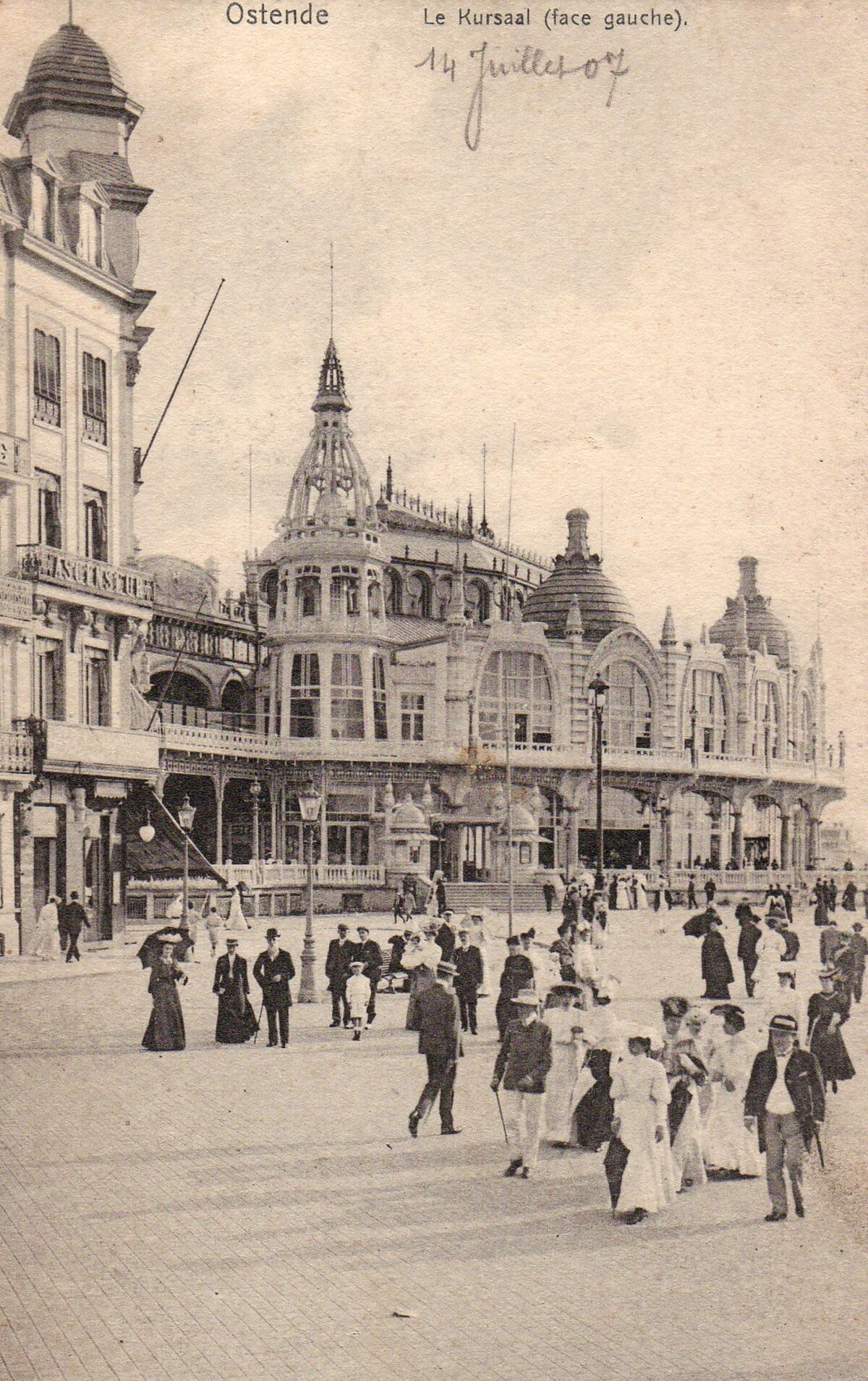 Nels. - Ostende - Le Kursaal (face gauche). - Datum : 14 juillet 07. - De Zeedijk, met zicht op detail van de noordgevel en la tourelle fleurie.