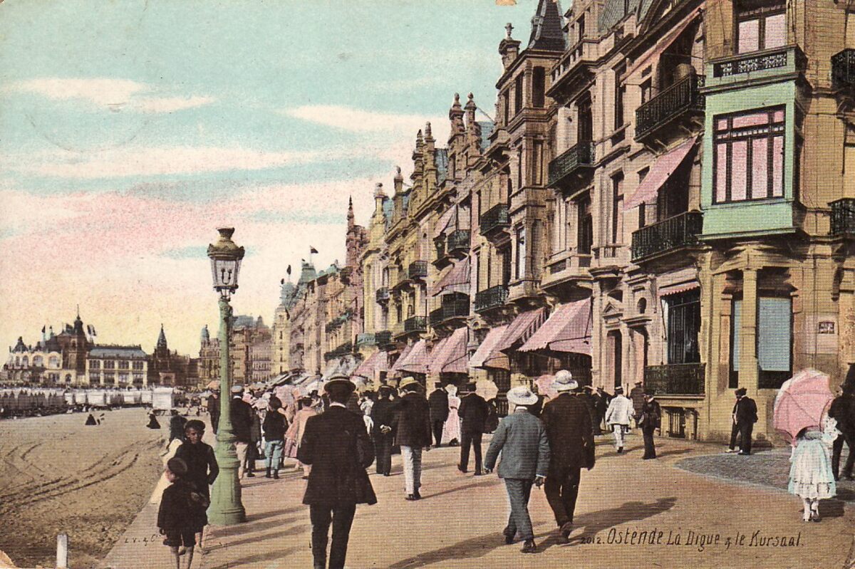 Bijgekleurde prentkaart, genieten van een wandeling op de zeedijk, met rechts zicht op de villa's.