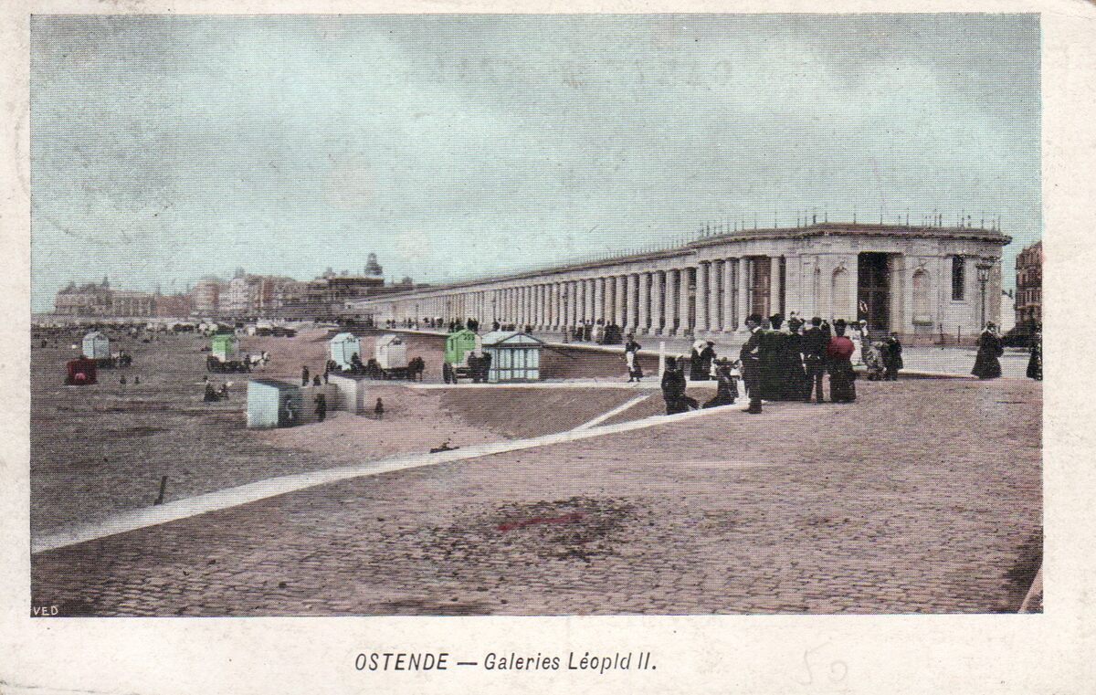 Ostende - Galeries Léopold II. - Bijgekleurde prentkaart. - De Koninklijke Gaanderijen langs de Zeedijk. Het Groot Strand en de traditionele badkarren