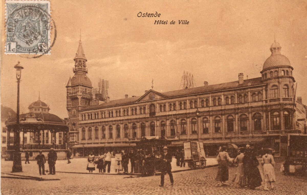 Dr. Trenkler nr. 13. - Het Wapenplein, met op de achtergrond het Stadhuis. Links, de muziekkiosk. Vooraan, een lantaarn met de eerste elektrische verlichting. Op de hoek, een ijscokar. Oostende in de Belle Epoque.