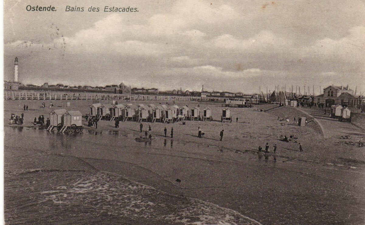 Ostende - Bains des Estacades. Carte Lux nr 38. Rechts het gebouw van de reddingsdienst, in de volksmond "De Permerensje". Links op de oosteroever de tweede vuurtoren en in het midden het gebouw van de "Quarantaine". In dit gebouw werden goederen en brieven die kwamen uit landen waar eventuele besmettelijke ziekten heersten, gedesinfecteerd. Na de Eerste Wereldoorlog geraakte het gebouw in verval en werd dan gesloopt. Vooraan op het strand de typische badkarren