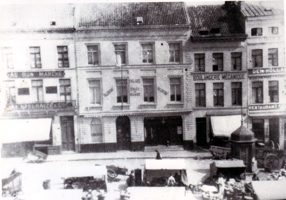 Foto 18 x 13. Van links naar rechts, "AD Delhaize & Cie", "Valentino", "Boulangerie Mécanique" en restaurant, pension, café "Den Hollander". De zaak werd toen uitgebaat door het echtpaar Eugène Hermé en Marie Van Batten. Later zette hun dochter de zaak verder en dit tot in 1973. In 1989 werd het gebouw samen met een aanpalend pand in de Dwarsstraat gesloopt om plaats te maken voor een handels en appartementen gebouw. Het paviljoentje rechts, ontworpen door Alban Chambon, regelt het debiet van het rioolwater.