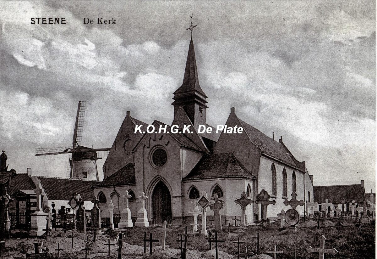 Foto (kopie) : 30 x 20 cm. - De Sint Annakerk dateert van voor 1625. De graven, gelegen voor de kerk, moesten plaats maken voor een pleintje. Links, op de achtergrond, de molen van Stene