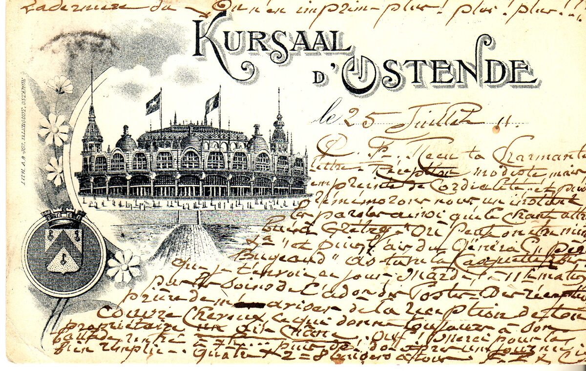Postkaart : Kursaal d' Ostende. - Versierd met het derde kursaal en het wapenschild van Oostende. Verzonden op 25 juli 1911 en gedrukt bij Lith. A. & Jos Elleboudt te Oostende.