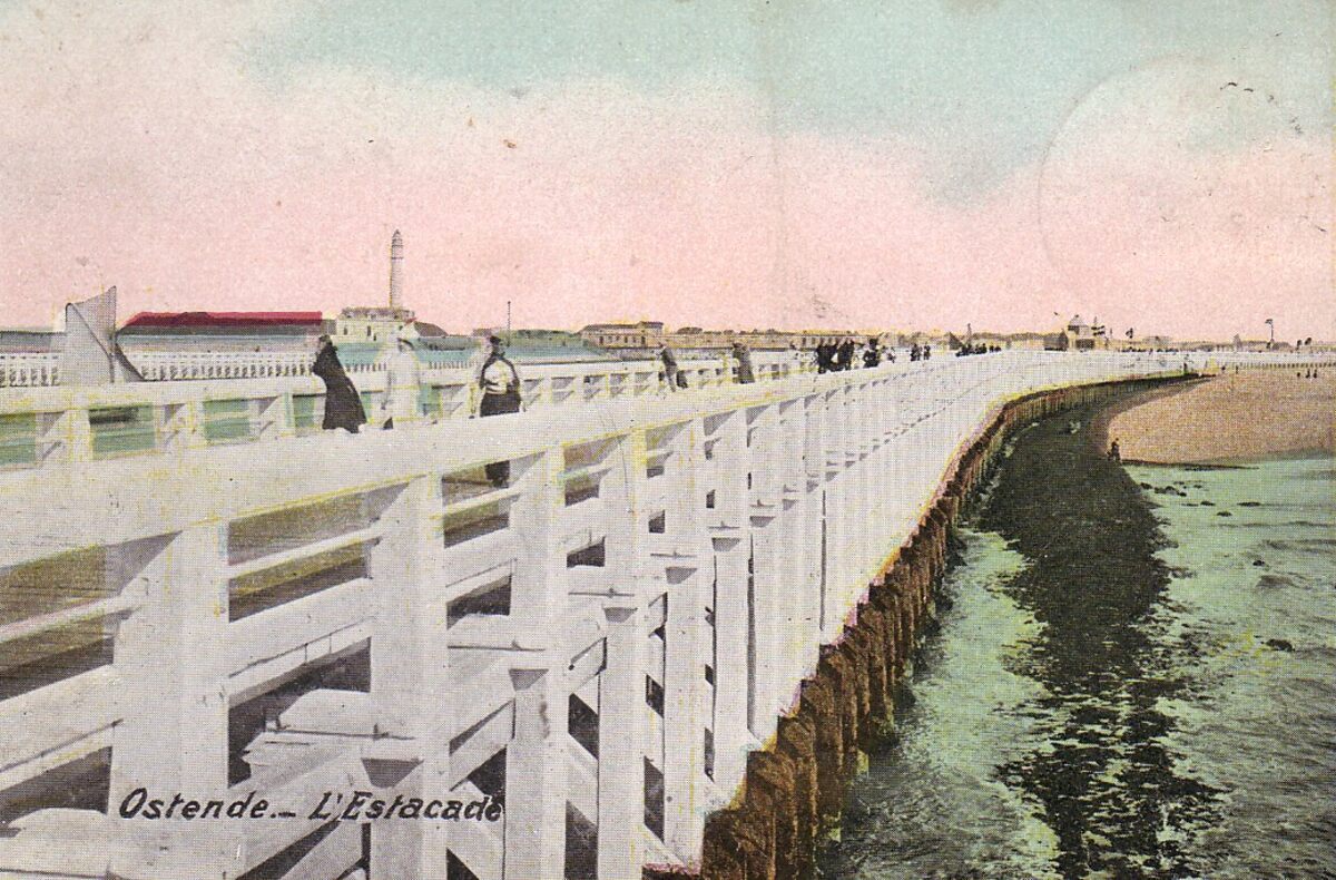 Bijgekleurde kaart. - Ostende - L'estacade. - Het Weststaketsel, met achteraan de tweede vuurtoren op de oosteroever. Rechts, detail van de "bas" (strekdam) en het Klein Strand